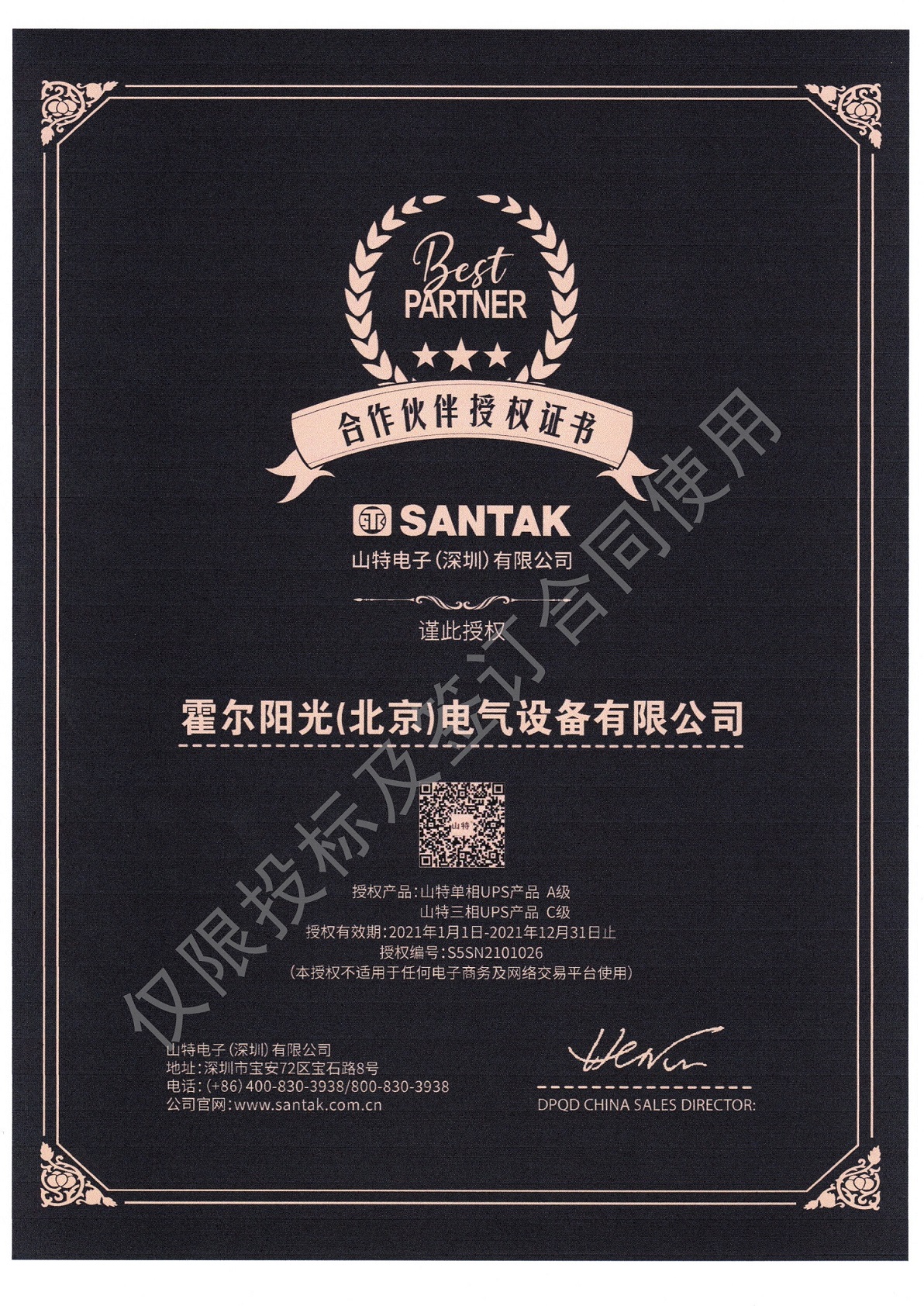 2021年霍爾陽光簽約山特代理證書